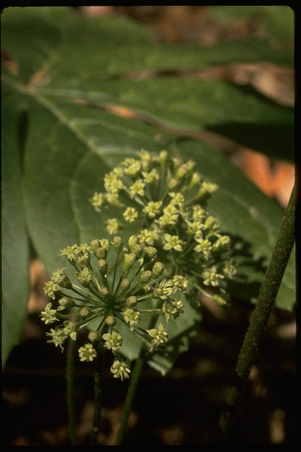 Aralia nudicaulis is sometimes called fool's sang since it is often confused with American ginseng (Panax quinquefolius), another member of the ivy family (Araliaceae). The two species may be distinguished by their leaves. As described above, Aralia nudicaulis has pinnately compound leaves while Panax quinquefolius has palmately compound leaves (with leaflets radiating from a single point).[6]