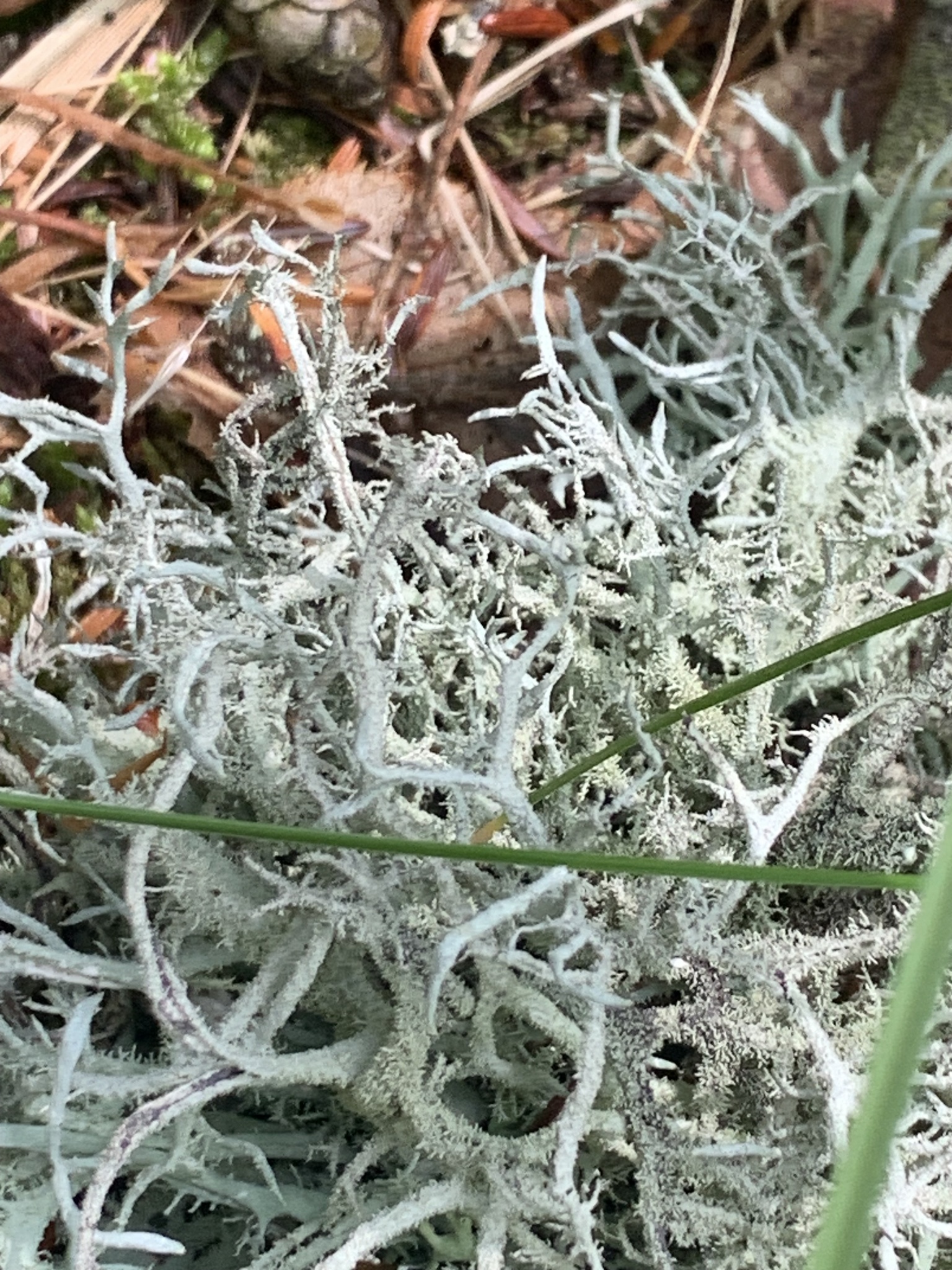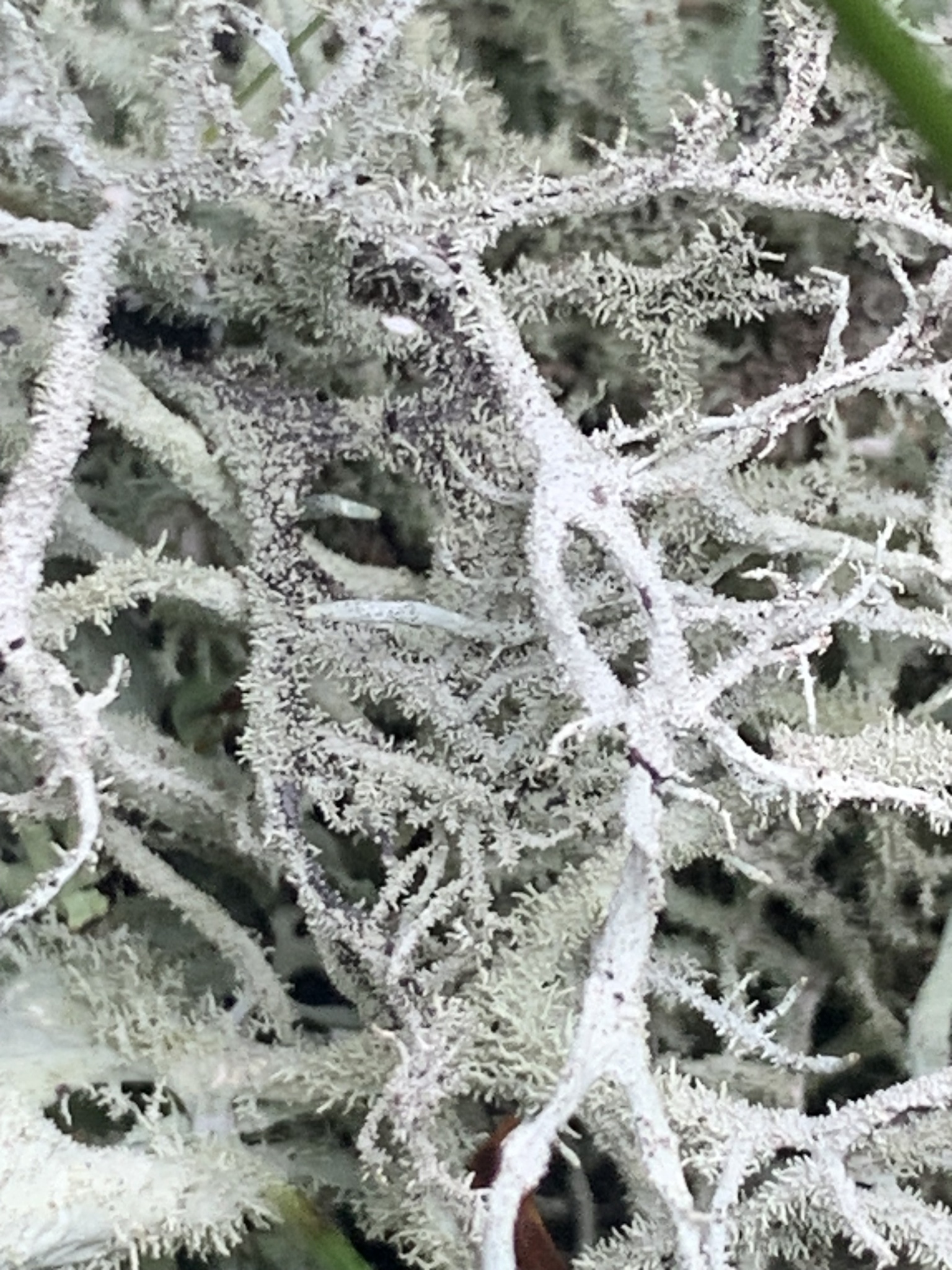 [edit]Pseudevernia consocians has a thallus form that can range from leafy (foliose) to somewhat bushy (fruticose). It usually measures between 4 and 10 cm (1.6 and 3.9 in) in diameter, and it has a smooth texture with a grayish hue. The lobes that compose the thallus are linear and dichotomously branched, overlapping each other with truncated tips, and they are typically 0.3–1.5 mm wide (some are up to 3 mm wide). Cylindrical isidia are abundant on the thallus surface, presenting tips that are darker than the rest of the thallus. The medulla is loosely packed and has a white coloration. The lower thallus surface is attached through basal holdfasts (without rhizines), with a color ranging from tan to black, sometimes with occasional white mottling. The pycnidia are positioned in either a laminal or marginal arrangement, and they can present as immersed, emergent, or sessile.[4]