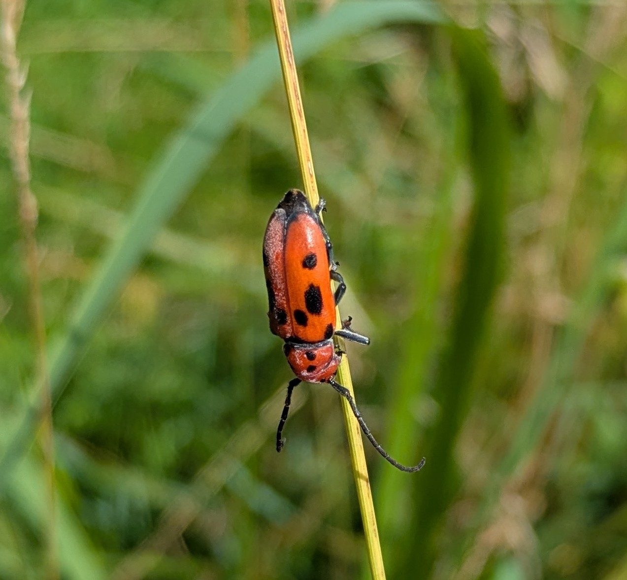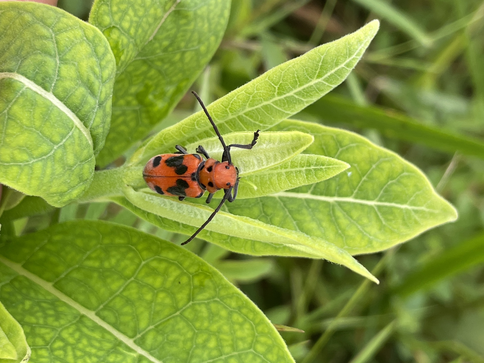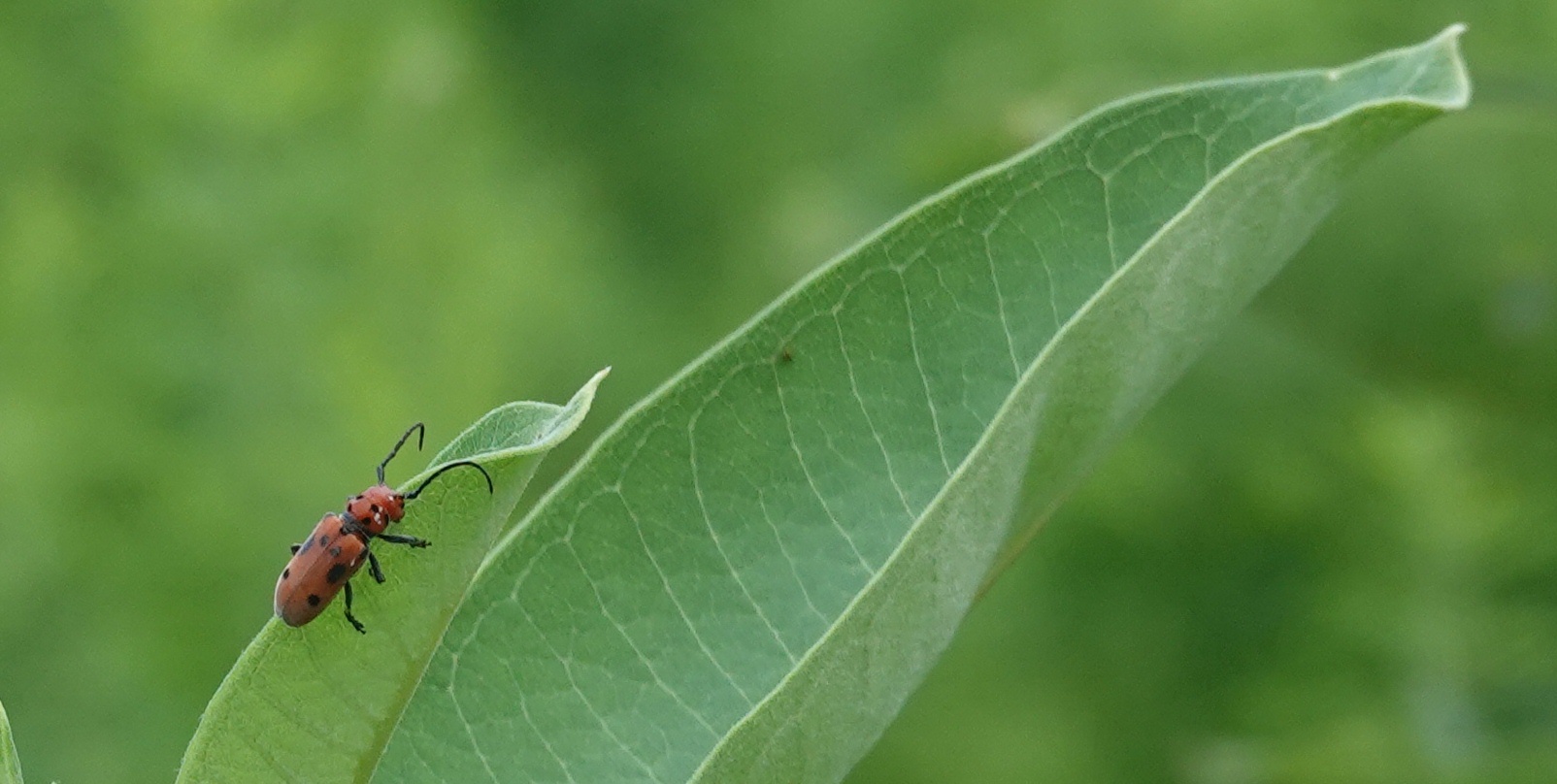 [edit]The milkweed beetle, an herbivore, is given this name because it is host-specific to common milkweed (Asclepias syriaca).[1] It has been reported on horsetail milkweed (Asclepias verticillata) in a disturbed site in Illinois.[1]: 81 [2]